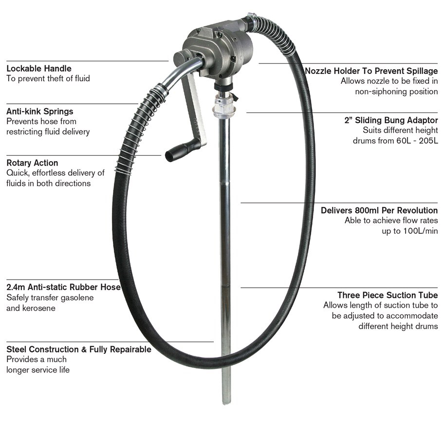 The pump is easy to prime and is capable of fluid delivery in both directions. The RAPIDFLO™ is supplied with a 3-piece suction tube, pump handle, 2" bung adaptor and 2.4m anti-static delivery hose.